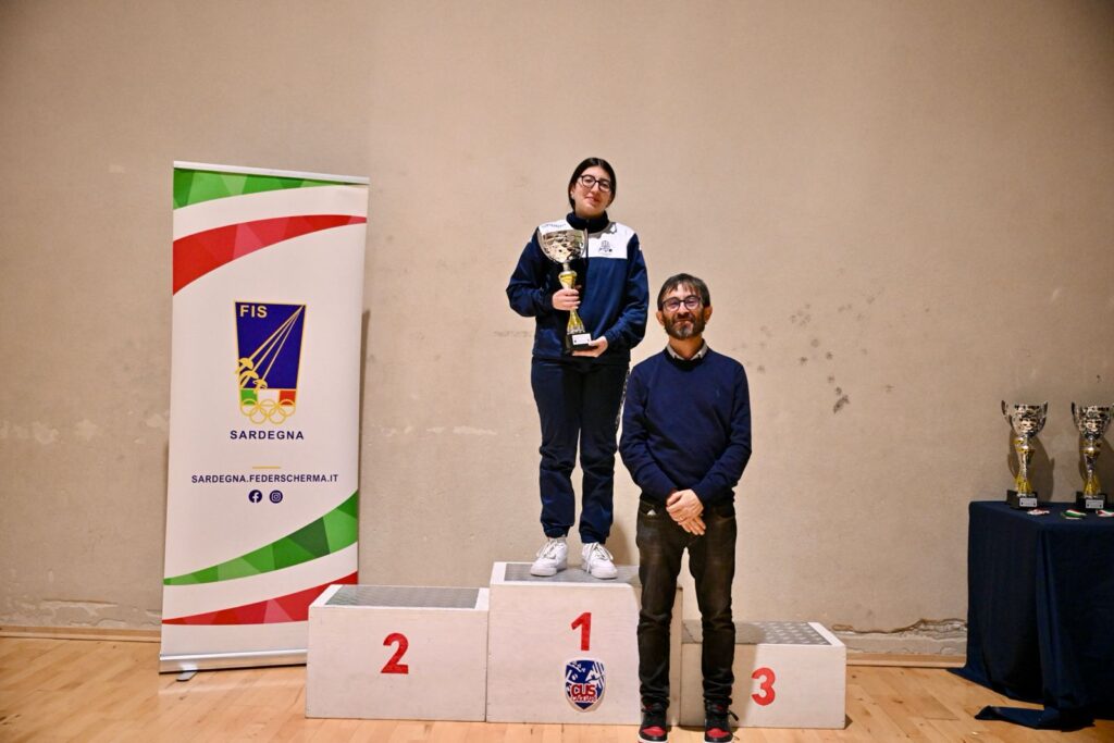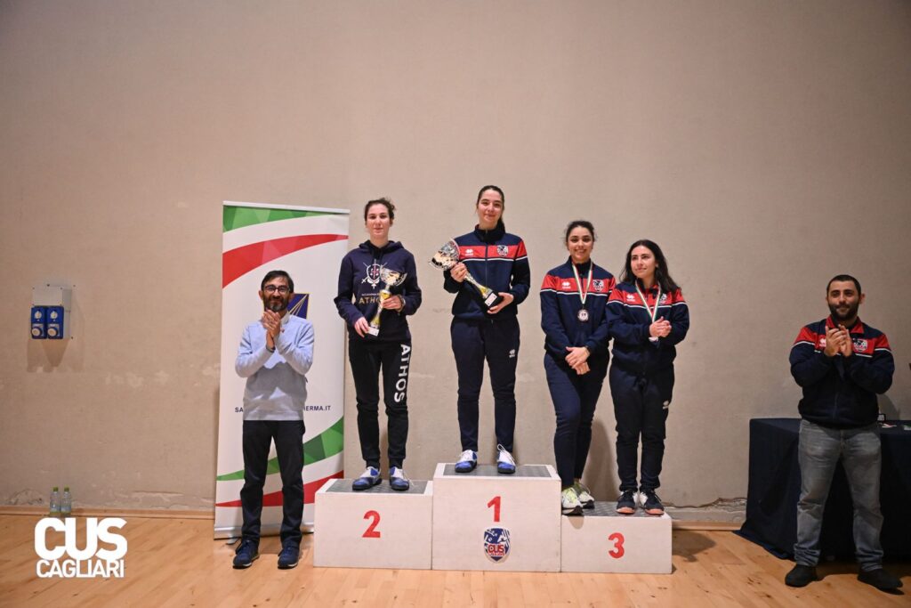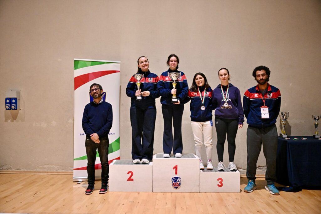 Cus Cagliari che centra la tripletta anche nel fioretto femminile con la vittoria di Elisa Irene Sanna, il secondo posto di Beatrice Signor, il terzo di Margherita Paoni pari merito con Giulia Aurora Mantega dell’Accademia d’Armi Athos.